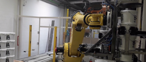 Filled paint buckets of different sizes are fed via roller conveyors to two special stacking devices where they are arranged on top of each other in exact positions on top of each other (handle alignment). The stacks are picked up by a robot and placed on a EUR-pallet adjusted by chain conveyors. A roller conveyor arranged in parallel allows the feeding of buckets, which are placed manually.