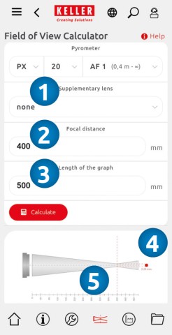 After entering the measuring distance (2) and the length of the measuring section (3), the resulting dimensions of the measuring surface (4) and the field of view (5) are displayed graphically and output in a table (6). If the pyrometer is operated with a supplementary lens, this must be selected from the list (1).