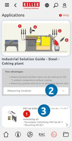 The Industrial Solution Guide is used to select the appropriate measuring system (3) for the conditions and measuring point (2) in the production plant after selecting the industry and application (1). All information and documents are available for the selected application solution.