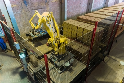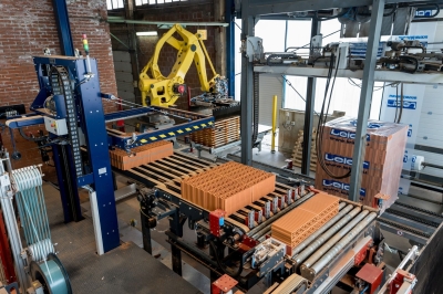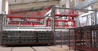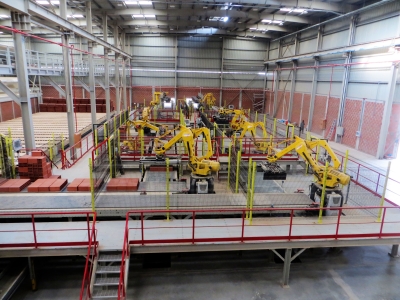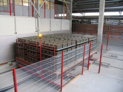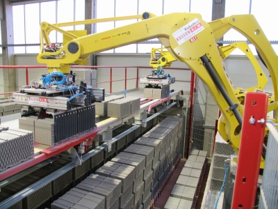 Empezando por la descarga de palets, el nuevo sistema de carga permite la carga de bloques cerámicos y bovedillas en carros de horno listos para la cocción: en función de la longitud de corte, se forman paquetes de 4 ó 5 hileras.
