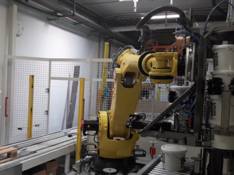 Palettisation de pots de peinture