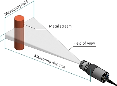 Pour déterminer la température de la brame, on utilise des pyromètres optiques qui mesurent sans contact, à une distance sûre, le rayonnement infrarouge de l'objet et en déterminent la température. Aux points de mesure pertinents, il y a un risque de forte vapeur d'eau et de fumée dans le champ de vision du pyromètre. Pour mesurer la température de manière fiable, on utilise des pyromètres bichromatiques.