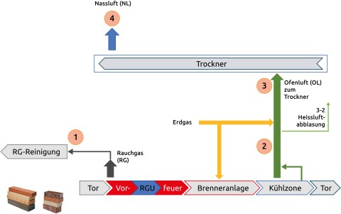 In einem Ziegelwerk fallen darunter mindestens die Rauchgasmenge am Tunnelofen, die Nassluft der Trocknung und überschüssige Ofenluft, die abgeblasen wird. Diese Energieströme können direkt in der Rohrleitung oder bei baulich schwierigen Anordnungen über Differenzmessungen vor und nach der Abblasstelle ermittelt werden. Die Messwerte können im KELLER K-Matic-System aufgezeichnet und ausgewertet werden bzw. mit anderen Datenloggern und Prozessleitsystemen verarbeitet werden.