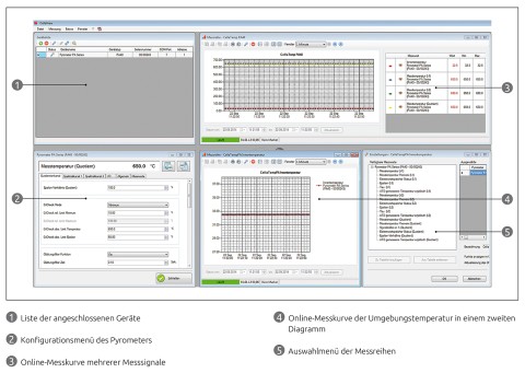 I valori misurati dei pirometri collegati possono essere visualizzati e salvati online come grafico sul monitor in una serie di misure comune o in serie di misure separate.