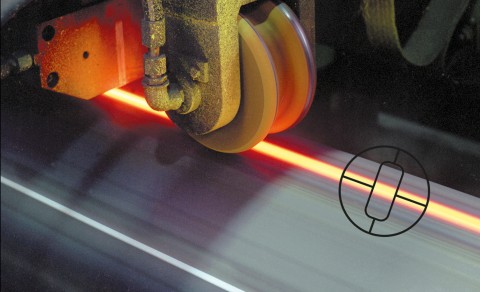 Um exemplo típico é a produção de tubos sem fim em que o material é dobrado e soldado. O material é aquecido com uma bobina de indução. A posição do pequeno ponto de soldadura pode flutuar, pelo que, com os aparelhos convencionais, o cordão de soldadura pode, por vezes, ficar fora do campo de medição e a medição deixa de ser possível (Fig. 6).